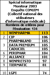 Le Collectif National des Utilisateurs d'Informatique Médicale (CONUIM) a réalisé une grande enquête sur les logiciels de gestion d'officine dans le Moniteur des pharmacies (supplément hors-série du 5 juillet 2003) . Les logiciels ont été passé au crible puisqu'ils étaient évalués sur 134 critères.