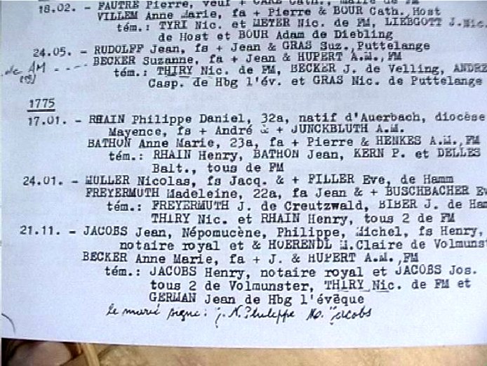 d'apres le registre paroissial de FReyming21/11/1775 mariage de J.N.Philippe JACOBS et Anne-Marie BECKER à Freyming