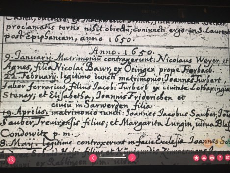 il est tisserand de laine drapier et épouse Maria ------ leur acte de mariage (13 nov.1642 pd burbach) se trouve dans le registre du Pasteur luthérien de Bouquenom